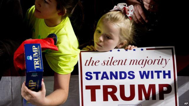 A young girl stands at the rope line at a rally in support of Republican presidential candidate Donald Trump at Muscatine High School in Muscatine, Iowa, Jan. 24, 2016.
